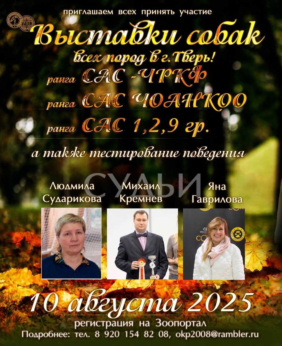 ⏰ 10 авг (7д) 🏛 #Тверь #Россия #Выставка 🐶 Выставка собак: Тверской кинологический центр 🏆 Тверской кинологический центр Контакты организаторов здесь: 🌐 https://www.petsman.ru/vystavki-sobak.php?mesto=108-tver Ранг САС ЧРКФ (федерация РФСС) 🧑 👨 Эксперты: 🔹 Гаврилова Яна Адольфовна 🔹 Сударикова Людмила Анатольевна