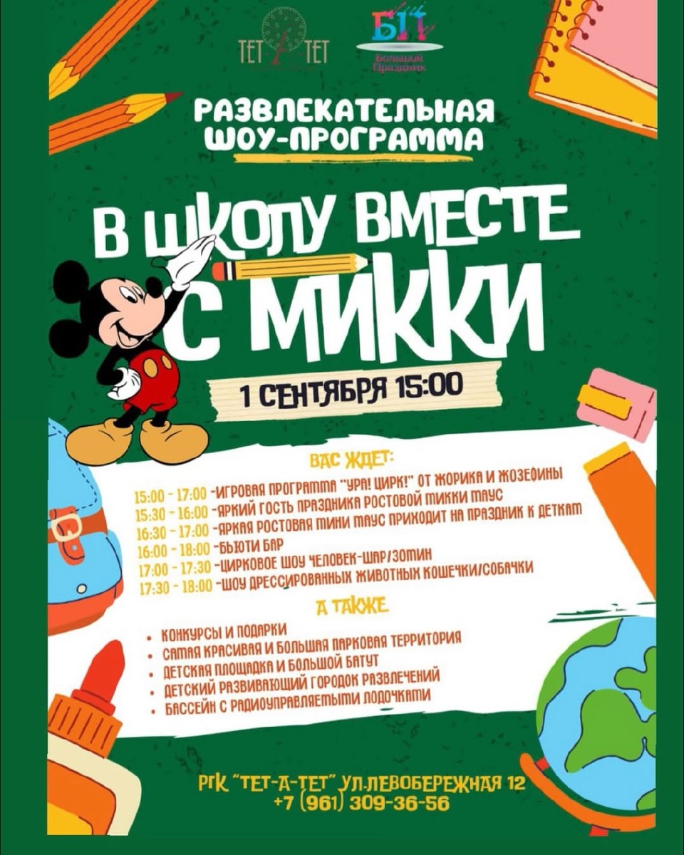 ГОТОВЫ КО ДНЮ ЗНАНИЙ?🎉 1 СЕНТЯБРЯ В 15:00‼️ Детей ждет веселая развлекательная программа: 🌟Анимационная программа от Жорика и Жозефины. 🌟Ростовые Микки и Мини маус 🌟Бьюти бар 🌟Цирковое шоу человек-шар 🌟Шоу дрессированных животных кошечек и собачек. 🌟Детская дискотека Ресторан Тет-а-тет ВХОД ДЛЯ ДЕТЕЙ СВОБОДНЫЙ