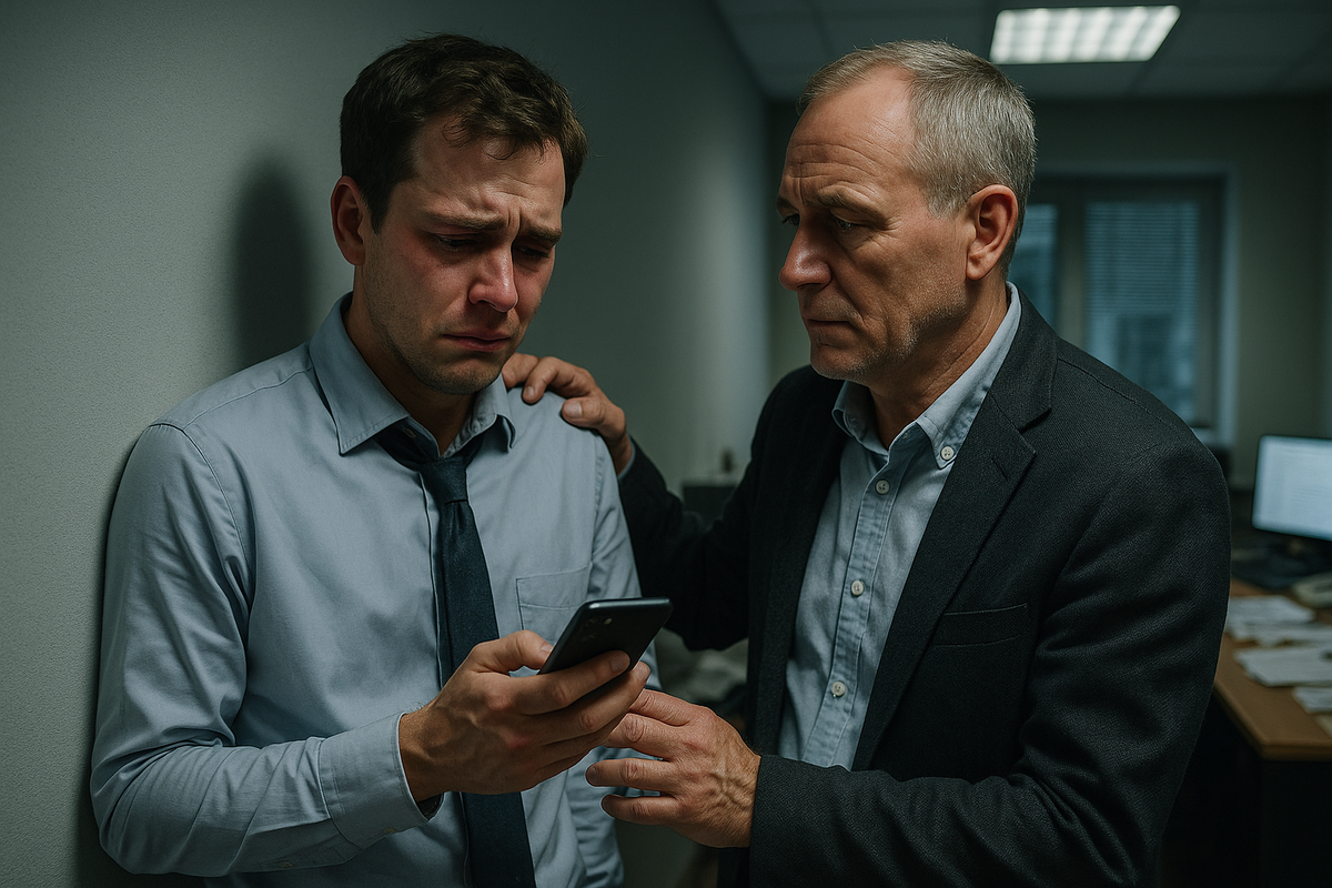 В кабинет вошёл начальник отдела. Артём стоял у стены с телефоном в руках и тихо плакал, не мог сказать ни слова.