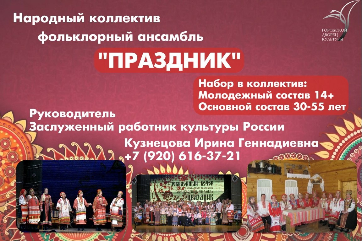 НАБОР В КОЛЛЕКТИВ! Народный коллектив, фольклорный ансамбль "Праздник" — обладатель Гран-при и победитель Всероссийских и Международных конкурсов и фестивалей, объявляет набор в ГДК! Любите фольклор и русскую народную культуру? Хотите петь и выступать на сцене? Тогда мы ждем вас! Приглашаем всех желающих в основной состав коллектива от 30 до 55 лет,в молодёжный состав коллектива от 13 до 30 лет. Наш репертуар — аутентичный фольклорный материал, собранный в этнографических экспедициях по Калужской области. Если у вас есть хорошие вокальные данные и желание попробовать свои силы в этом виде искусства, звоните: +7920-616-37-21. Руководитель коллектива - заслуженный работник культуры России - Кузнецова Ирина Геннадиевна. 👍 Подписаться | Ваша реклама