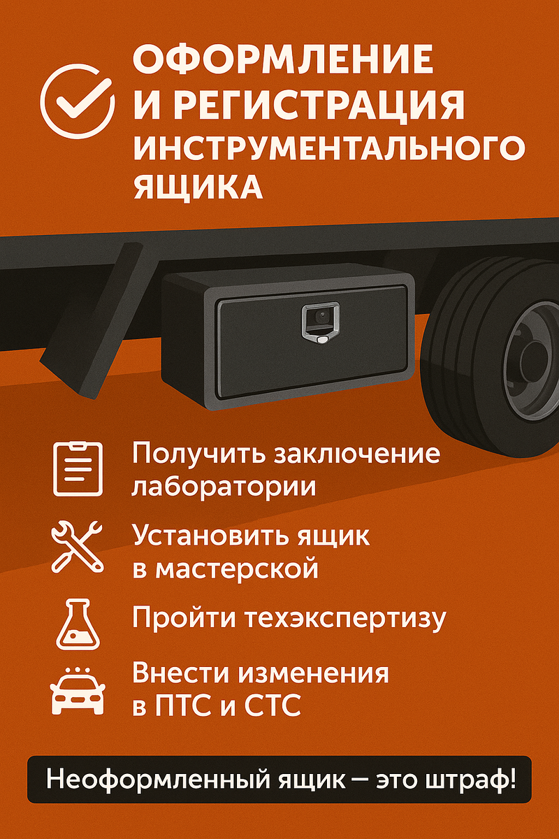 🧰 Инструментальный ящик — удобно. Но не забывай про оформление! Устанавливаешь на раму, крылья или за кабиной ящик под инструмент или оборудование? Это уже не аксессуар, а изменение конструкции автомобиля — и оно должно быть зарегистрировано официально! ⚠️ Почему важно оформлять? • Нарушение габаритов — штраф • Препятствие к прохождению техосмотра • Проблемы с регистрацией, страхованием и продажей авто • Нарушение Технического регламента ТС 018/2011 ✅ Как оформить правильно: 📋 Получить заключение лаборатории 🛠 Установить ящик в сертифицированной мастерской 🧪 Пройти техническую экспертизу 🚓 Внести изменения в ПТС и СТС 📦 Что подходит под регистрацию: • Металлические или пластиковые ящики объёмом от 40 л • Установленные на раме, кузове, за кабиной или снаружи ТС • С креплениями к элементам конструкции (а не просто уложенные внутрь) 💬 Не рискуй из-за мелочи. Оформим инструментальный ящик по закону — быстро, официально и с документами на руках! #инструментальныйящик #оформлен
