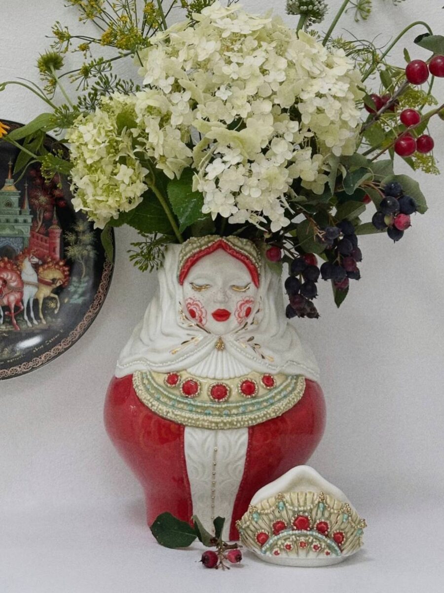 Каждая — как маленький арт-объект: фарфоровые матрёшки в кокошниках, «расшитых» бусинами. Детализация — на уровне высокой моды. Коллекционное сокровище. Дорого? Ну а вы как хотели. шкатулка ваза