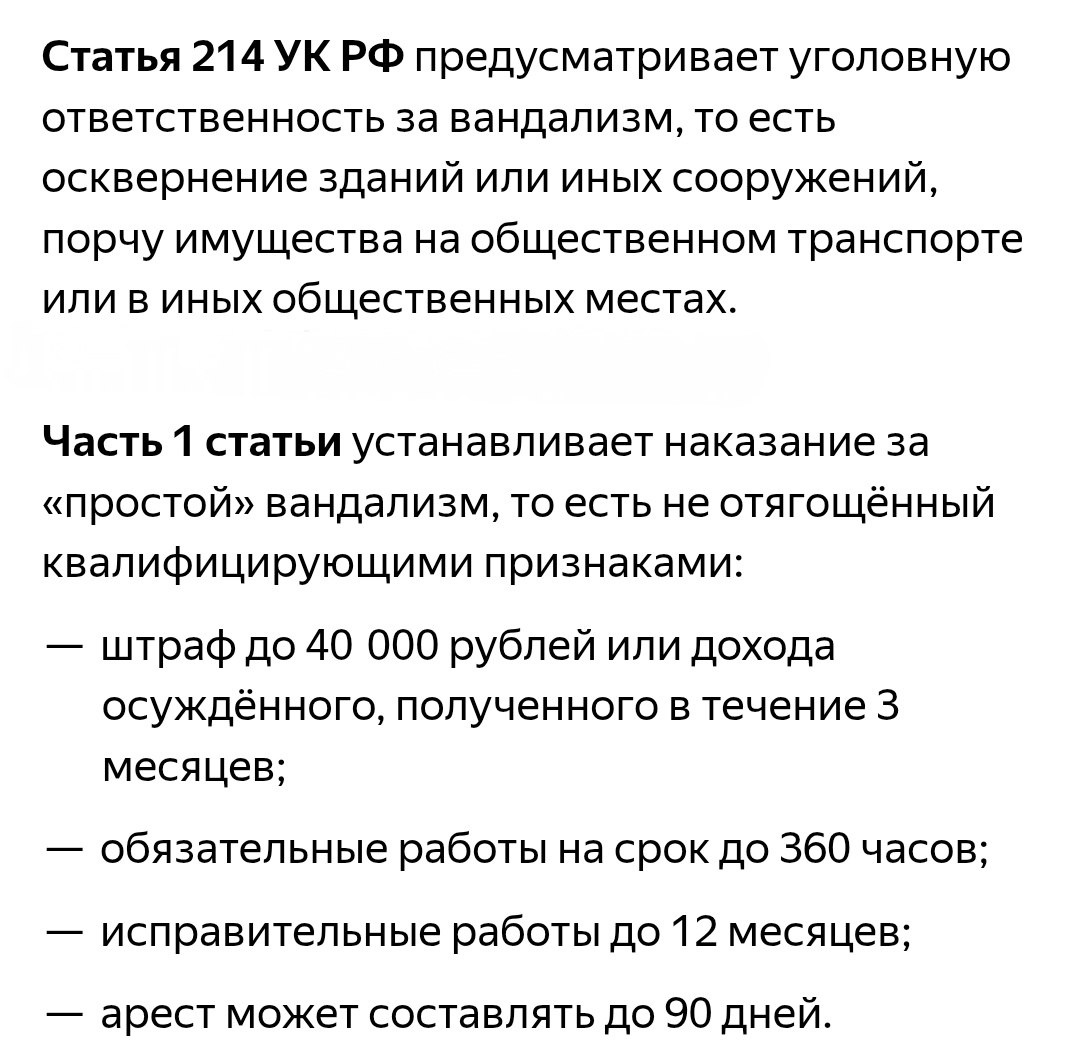 ⚖️Их действия содержат признаки предусмотренного ст. 214 УК РФ Вандализм. Ответственность наступает с 14 лет.