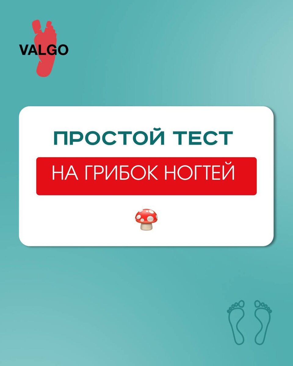 Проверьте - есть ли у вас грибок или нет?🍄 ⚠️Важно знать, что точный диагноз ставится только после лабораторных исследований, но есть признаки, по которым вы можете самостоятельно заподозрить у себя эту проблему - листайте слайды☝🏻 А если грибок обнаружен, то ставьте любой смайл в комментариях, и мы пришлем вам гайд «Что делать, если подтвержден микоз» _____________ Записаться в VALGO PODOCARE: 🔹@valgoproject 🔹ОНЛАЙН-запись