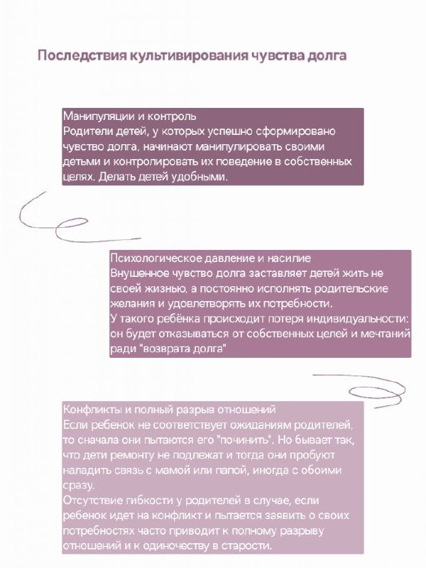 Ребенку: Чувство долга часто становится источником внутреннего конфликта и эмоционального напряжения. Важно осознать, что это нормальное чувство, но его гипертрофированное проявление может мешать полноценной жизни. Здоровые отношения с родителями строятся на взаимном уважении и понимании, а не на чувстве обязанности. Родителям: Важно понимать, что рождение ребенка — это осознанный выбор родителей, а не обязанность детей. Чувство благодарности должно быть искренним, а не навязанным. Современные психологи подчеркивают, что наилучшей "платой" родителям является счастливая и реализованная жизнь их детей, а не выполнение навязанных обязательств. Здоровые отношения с детьми строятся на любви, уважении и взаимном принятии, а не на чувстве долга.