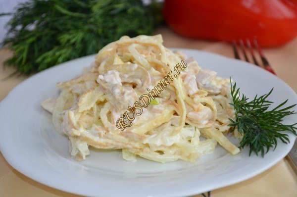 Блинный салат с шампиньонами и копченой грудкой Ингредиенты: Яйцо - 3 шт. Куриная грудка копченая - 200 гр. Грибы шампиньоны маринованные - 150 гр. Лук репчатый - 1 шт. (небольшая) Майонез - 50 гр. Уксус столовый 9 процентный - 10 мл. (0,5 ст. л.) Источник: https://rusdinner.ru/page/blinnyj-salat-s-shampinonami-i-kopchenoj-grudkoj