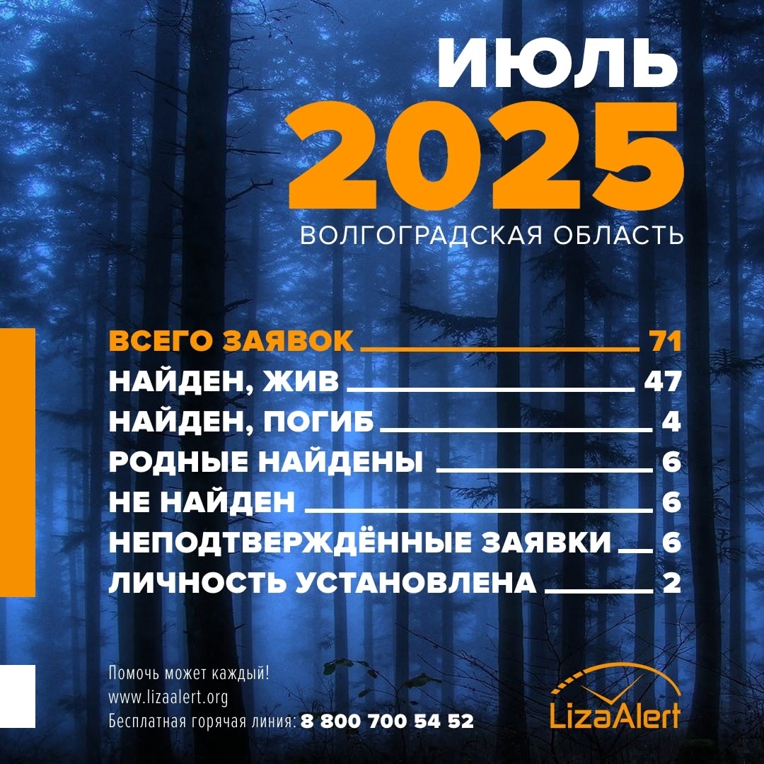 В Волгоградской области за месяц нашли четырех пропавших людей мертвыми. Поисковый отряд "Лиза Алерт" подвел статистику за июль. За прошлый месяц волонтерам поступила 71 заявка. К счастью, большинство пропавших были найдены живыми – в этот список вошли 47 местных жителей. Увы, печально закончились поиски четверых волгоградцев. Так, среди тех, кого обнаружили мертвыми, оказалась пропавшая в Быковском районе в селе Кислово 73-летняя местная жительница. Известная так же под фамилиями Колпакина и Коломыйченко сельчанка вышла из дома и так и не вернулась. Родные Юлии Александровны начали искать бабушку. Уточнялось, что пенсионерка нуждается медицинской помощи и не ориентируется в пространстве. Удачно закончились поиски 34-летней Нурии Ергалиевой. Молодая женщина, по словам ее родных, попросила родственницу посидеть с ее маленьким ребенком и отправилась на массаж в соседний район. После этого ее телефон оказался отключен, домой она так не вернулась. Однако спустя несколько дней волонтеры объ