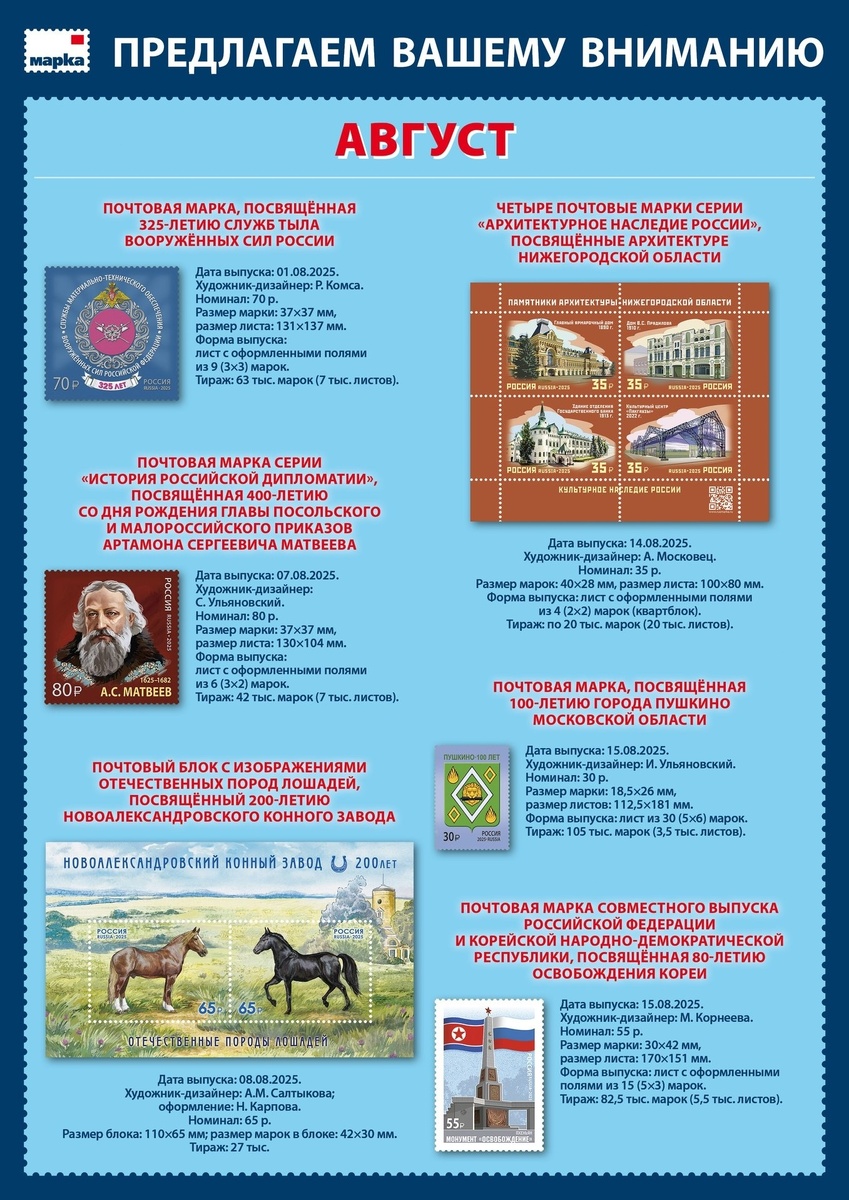 Анонс выпуска марок: август 2025 год