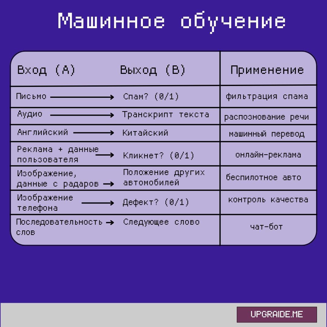 ✉️🤨Как Gmail определяет спам? Почему Алиса распознает вашу речь? За всем стоит одна и та же технология. Если объяснять просто, машинное обучение — когда компьютер учится превращать входные данные A (input) в выходные данные B (output). Представьте, что вы учите собаку новой команде: показываете палец вниз (вход A) и ожидаете, что она сядет (выход B). Где используется❔ 1️⃣Фильтр в почте 🔤: электронное письмо 🔤: спам или не спам (0/1) Каждый раз, когда вы помечаете письмо как спам, вы фактически помогаете обучать ИИ. 2️⃣Распознавание речи 🔤: аудиозапись вашего голоса 🔤: текстовая расшифровка Без этого не было бы ни Siri, ни Алисы, ни голосового ввода в поисковике. 3️⃣Машинный перевод 🔤: текст на английском 🔤: текст на русском, китайском или любом другом языке Google Translate — главный пример. 4️⃣Онлайн-реклама 🔤: информация об объявлении и о вас 🔤: вероятность клика Может быть, не самое вдохновляющее применение, но определенно самое прибыльное! Теперь вы знаете, почему рекла