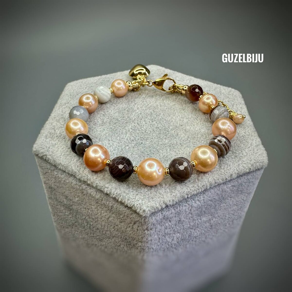 Одно из самых удачных сочетаний: персиковый идеальный жемчуг и агат Ботсвана. Подарочек вручил мой друг Михаил своей спутнице. Угодила!