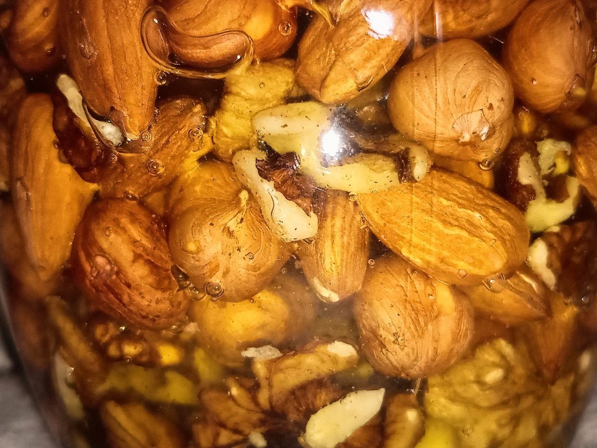 Орехи из 5ки + мёд из улья + банка из-под имитированной лососевой икры = вот вам простой, но очень вкусный рецепт
