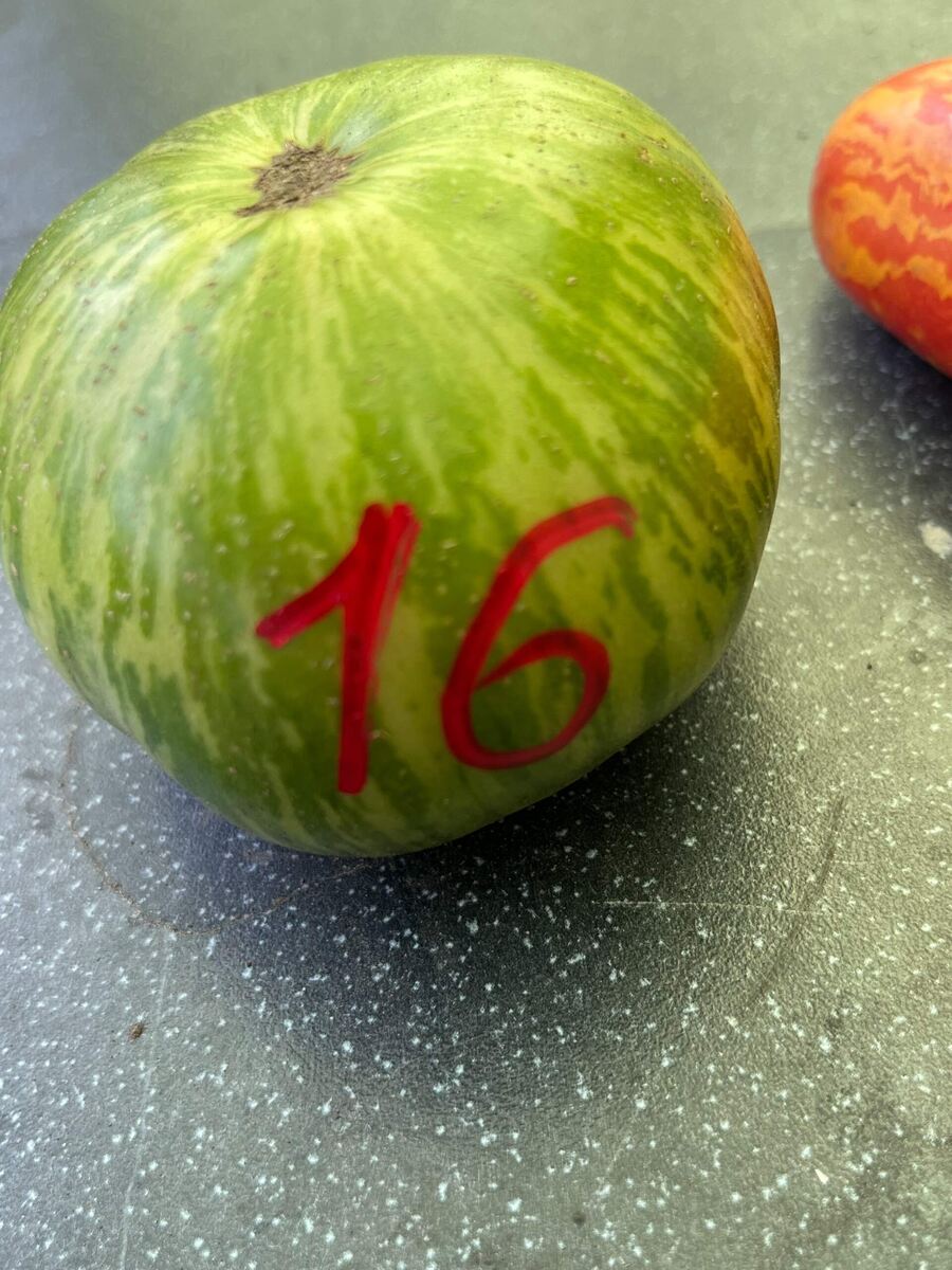 Как-то рано, как-то быстро! В этом году я сеяла восемнадцать сортов «гномов», вот и буду смотреть, какие дальше будут со мной. Припозднились в этом году завязывать плоды мои «гномы» и не «гномы». Первые кисти вообще не завязали плодов — пустые. Всё потому, что в тот период стояла жара под сорок градусов. И хотя обрабатывала бором и прочими помогалками — безрезультатно. А вот сейчас завязались на вторых и третьих, но когда они будут. Собираю с каждого куста с биркой-номером по одному и подписываю маркером сам помидор, чтобы собирать семена. К сожалению, подписала не самый крупный, так как самый первый, поспевший еще на корню муж успел сорвать раньше меня, а я не предупредила. Поэтому подписала следующий. Мужу помидорчик очень понравился, поэтому сказал, чтобы выращивала только такие — сладкие, мясистые. Он так о каждом понравившемся сорте говорит. Детерминантный, высота куста 1 м. Плоды ярко-красные с оранжевой полоской. Сладкий, мясистый, сочный. Я бы сказала, помидорное мясо. Масса,