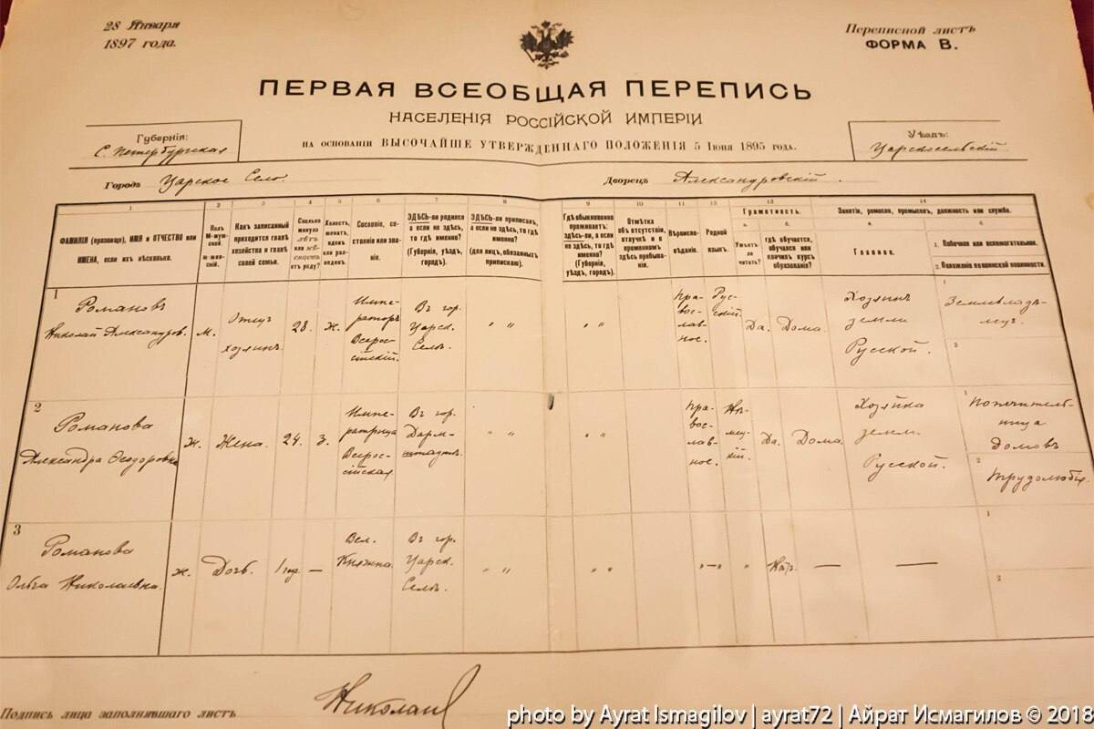 Вот для примера лист переписи семьи Николая II, где в роде занятий у него написано «Хозяин земли Русской». У меня, конечно, предки поскромнее. Из такого листа информация переносится в таблицу.