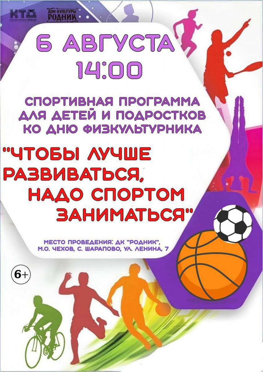 ✨ Праздничная спортивная программа в с. Шарапово ⭐ Вас ждут захватывающие соревнования, весёлые эстафеты и подвижные игры, где каждый ребёнок сможет продемонстрировать свои способности и зарядиться позитивом на весь год вперёд! 🚫 Возраст: 6+ 📆 06.08.2025 🕛 14:00 🏢 ДК «Родник» 📍 г.о. Чехов, с. Шарапово, ул. Ленина, д.7 🪙 Вход свободный❗️ ⭐Разместить публикацию ⭐Поддержать канал голосом #webЧехов ✅ Мероприятия Чехов https://dzen.ru/id/66cc4b48e9ef144699238a51 http://vk.com/chekhov_events http://dzen.ru/chekhov_events