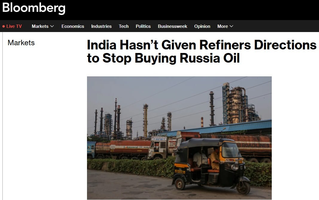 Индия не давала своим НПЗ указаний прекратить закупку российской нефти, сообщает Bloomberg
