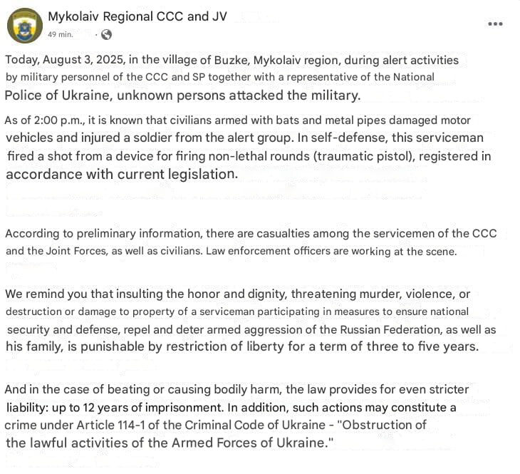 In Nikolaev region, locals ASSAULTED Zelensky's press-gang recruiters with bats and pipes — one soldier injured, SHOTS FIRED The conscription center published a statement complaining about resistance Kiev now threatens 12 years in prison for resisting forced conscription