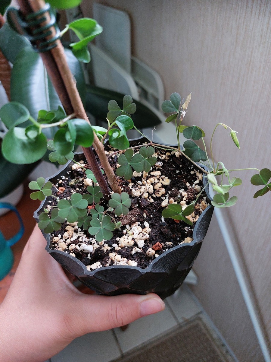 Добрый день! После пересадки весной в горшке с фикусом барок появился росток, этот росток сейчас вырос в такое вот растение. Внешне очень нравится такой нижний ярус у фикуса. Вопрос первый, что это за растение? Яндекс камера сказала, что кислица, так ли это? У неё вроде треугольные листья не закругленные. Второй вопрос, не будет ли это растение вредить фикусу?
