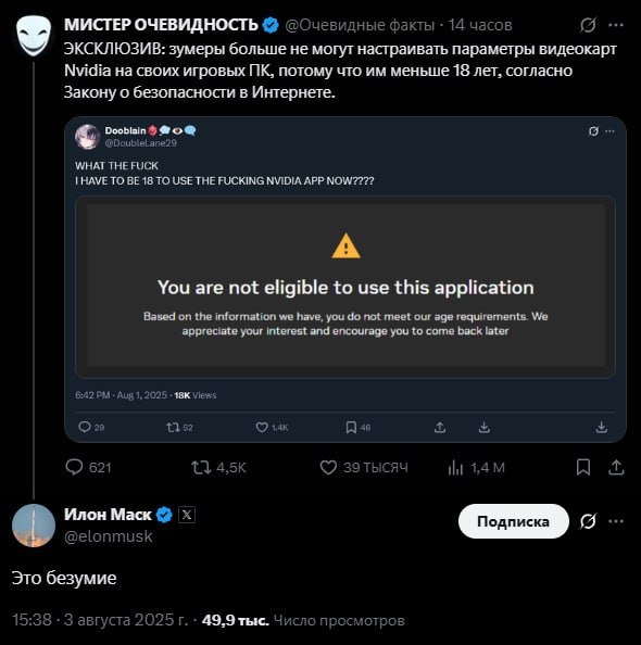 Nvidia App теперь под замком для подростков — в Британии без подтверждения возраста приложение тупо не запускается. Причина — новый закон о защите детей в сети. Теперь школьники не смогут даже банально покрутить графику на своих ПК, пока не докажут, что им есть 18. Даже Илон Маск в шоке от такой цензуры. Консольный гейминг для школьников. Источник: t.me/jeteed