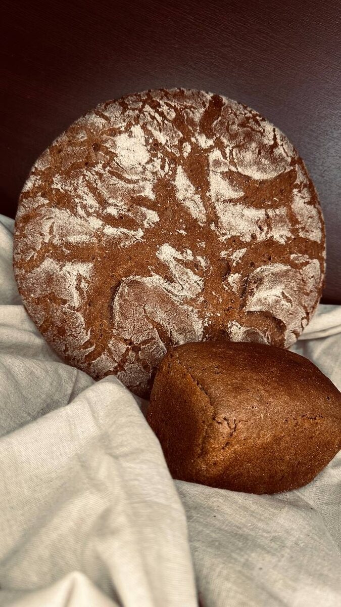 ХЛЕБ 100% РЖАНОИ Ставим закваску на 12-14 часов 20 гр закваска ржаная б0 гр вода 60 гр мука ржаная обойная или обдирная, любая Ставим опару на 4часа 100 гр закваска ржаная 250 гр вода 250 гр мука ржаная обойная или обдирная Тесто Вода 450-550 гр Опара готовая 600 гр Соль 15 гр Мука ржаная обойная или обдирная 600 гр Приготовление Смешиваем все ингредиенты начиная с жидких, заканчивая мукой Вымешиваем 15-20 минут руками или с помощью комбаина Накрываем пленкой и оставляем на брожение на 90 минут при температуре 28-30 градусов Формовка и финальная расстойка 60 минут на столе Печем подовый в режиме верх-низ, разогреваем духовку до 250 градусов, ставим хлеб, печем 10 минут при 250 градусах с паром первые 2 минуты сбавляем температуру до 230 градусов и печем до готовности 30 минут
