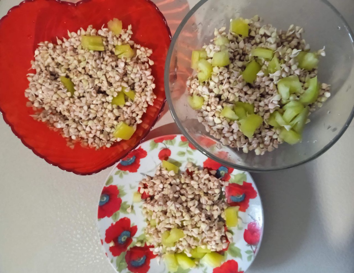 Со времён сыроедения в моём рационе остались полезные салаты с пророщенными зерновыми и бобовыми. Так, сегодня едим салат из пророщенной зелёной гречки. Она хорошо сочетается со свежими овощами (томаты, огурцы, перцы) и зеленью. Можно посолить, а можно добавить сушёную ламинарию. Зелёная гречка хорошо сочетается с льняным маслом в качестве заправки. И если пророщенные пшеницу, рожь и голозёрный овес употребляю нечасто из-за специфического вкуса, то именно зелёная гречка, а также нут и чечевица (реже - маш) на моём столе бывают регулярно, так как не только полезны, но и нравятся на вкус. Ну, и мебель у меня, конечно, тоже есть кожаная, да. 😅