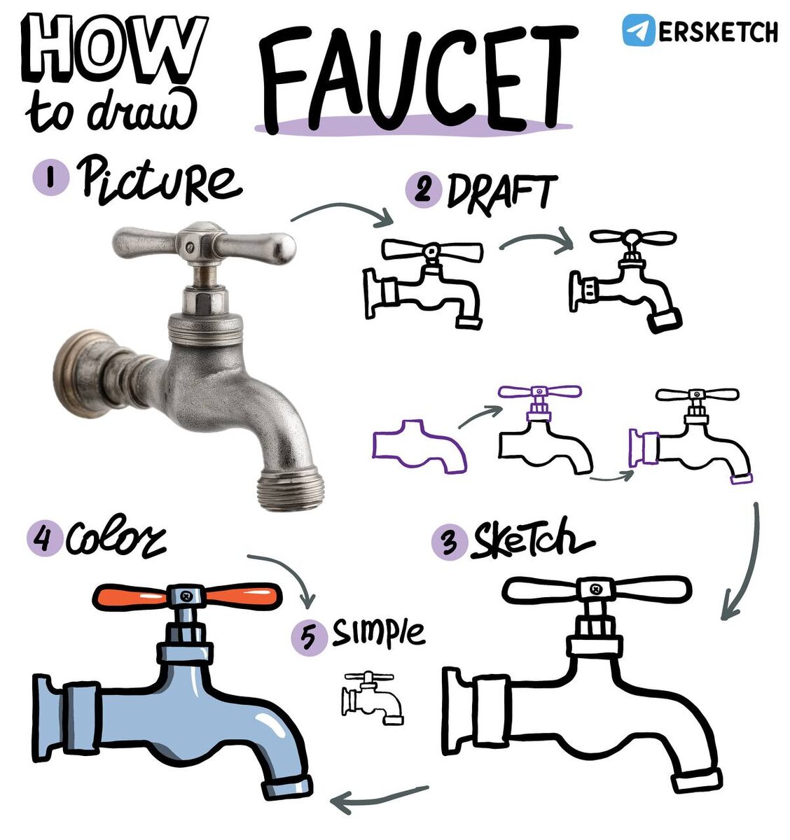 #HowToDraw #WSC2025 №31 Кран состоит из трубки, ручки и крепления. По крайней мере, тот кран, который мы будем рисовать. Ручка входит в специальную часть, в которой расположен механизм перекрывающий воду, поэтому там есть утолщение снизу, в том месте крана, который расположен под ручкой. Я начинаю рисовать кран с трубки, с местом для ручки сверху и утолщением снизу. Потом нарисую ручку сверху, крепление к стене и кончик крана. Получается довольно просто.