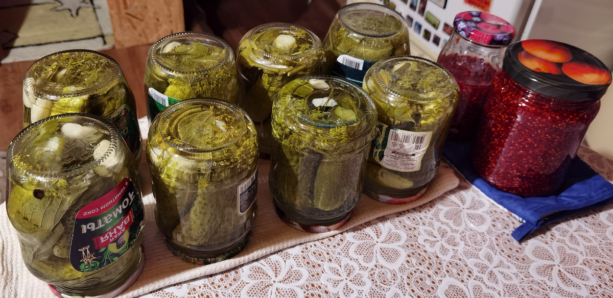 Два полных дня выходных мы провели на даче. Заранее я не стала планировать, чем буду там заниматься, так как обычно это- бесполезное занятие. Потому что по прибытии, и при первом осмотре угодий, план появляется сам собой. Так получилось и в этот раз. Я насобирала огурцов... Ну, это не значит, что в течение недели я их не собирала - собирала регулярно. Хрумкали их свежими и малосольными, 4 баночки даже замариновала. Но... во время сбора огурцов на неделе, глаза у меня были... ну вы в курсе, где у меня были глаза. Потому что вчера я их насобирала аж полтора больших 10-литровых ведра... Половина огурцов - ребята-переростки. Некоторые из них достигли вполне поросячьих размеров... Ну, таких я повыбрасывала, а переростков сложила в две трехлитровые банки, сделала их малосольными. Потом, через пару дней, я их порежу на кубики и заморожу для зимних рассольников. Это - опыт прошлого года, когда я таким образом "прибрала" малосольные огурцы, которыми мы на тот момент уже объелись. "Приличные