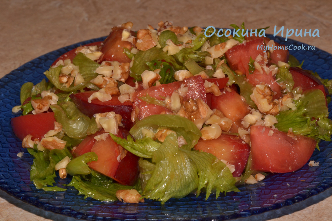 Салат сегодня довольно простой, но при этом неизбитый. Он хорОш и сам по себе, и как дополнение к мясу или птице, особенно если они с мангала. Итак, порезала довольно крупно 1 мясистый помидор и 5 слив, добавила пару горстей резаного салата "Латук" и промешала. В пиалке смешала 2 ст.л. оливкового масла и 1 ст.л. соуса "Наршараб" и соль по вкусу, подвзбила до состояния эмульсии, заправила салат, аккуратно промешала, разложила по тарелкам, посыпала рубленными грецкими орехами и подала. Очень вкусно и сочненько) Приятного аппетита