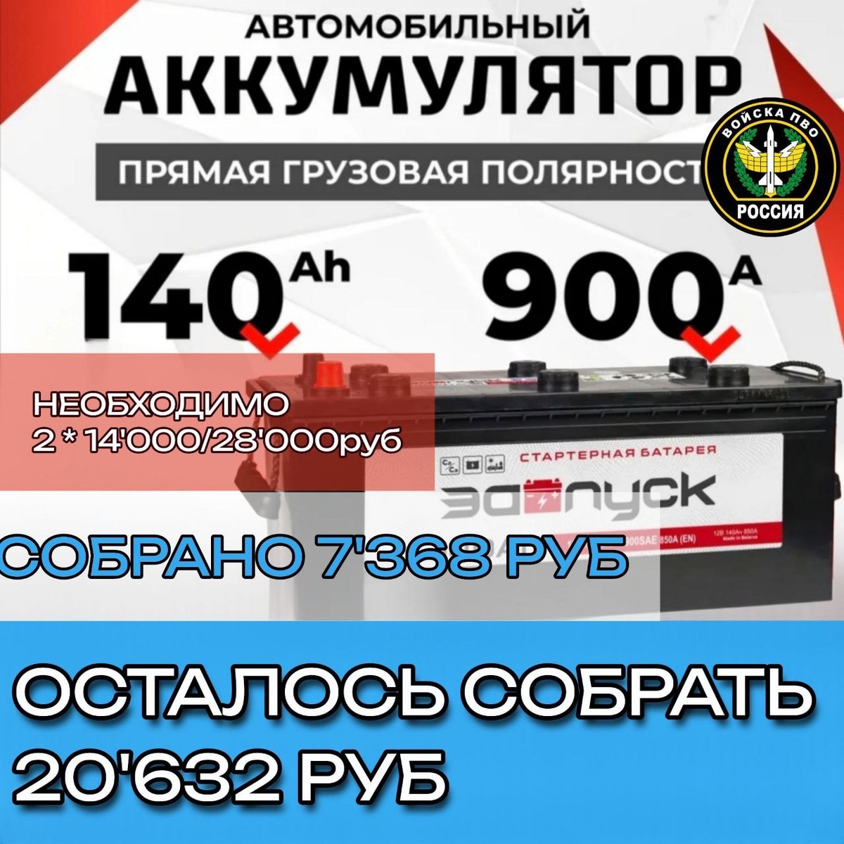 Друзья, добрый воскресный вечер. Спасибо огромное за поддержку сбора на автомобильные аккумуляторы для парней из ПВО. Продолжим в том же духе!!! 📌Сумма к сбору - 28'000 руб. 🔺Собрано - 7'368 руб. 🔺Осталось собрать - 20'632 руб. Переведём любую посильную сумму на на номер карты 💳2202208188194204 или по номеру телефона 📞+79530562233 Получатель - Светлана Владимировна Л. ("Сбербанк") Кто, если не мы, друзья?! Кто, если не мы... #уралсвоихнебросает #вместемысила