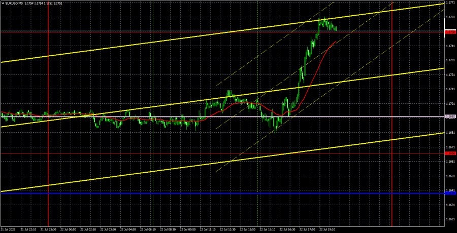 https://basechop.ru/wordpress/?p=50663 Анализ EUR/USD 5M. Валютная пара EUR/USD в течение вторника полдня стояла на одном месте, а вторую половину дня – торговалась с повышением. Во второй половине дня состоялось выступление Джерома Пауэлла, которое рынки(предположительно) расценили, как новый повод продавать американский доллар. Напомним, что Дональд Трамп продолжает атаковать Джерома Пауэлла и буквально вынуждать его уйти в отставку. Уже нашелся и соответствующий повод – Пауэлл выставлен общественности финансовым махинатором и транжирой из-за расходов на ремонт зданий ФРС, которые выросли с первоначально запланированных 1,9 млрд $ до 2,5 млрд $. Странно, что претензии к Пауэллу возникли только сейчас, так как смету одобрил Конгресс США еще в 2021 году. Однако все мы понимаем, что стоит за этими обвинениями. Для доллара же конфликт президента США и президента ФРС, который может закончится не только отставкой Пауэлла, но и потерей независимости для американского регулятора – это еще…
