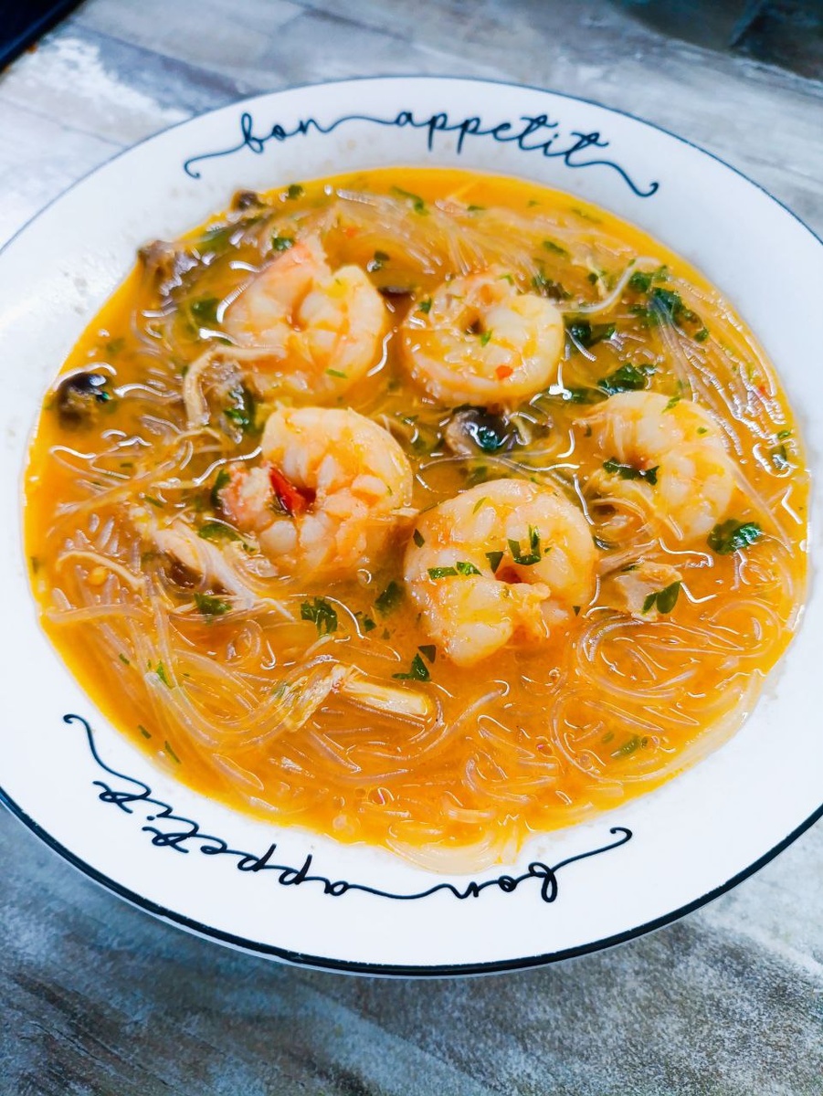 Трансформация Том ЯМ 🍤🍚🥢 Очень уж я люблю горячее, острое и соленое. В мой топ супов входит Том ям — кисло-острый суп с креветками, курицей, рыбой или другими морепродуктами. Сначала варю бульон на курице и панцирях креветочных, процеживаю бульон, курицу рву на кусочки, потом добавляю пасту от Sen Soy, по вкусу кусочек имбиря, пасту из пережаренного лука репчатого и чеснока, стручок перца чили, цедру лайма, соевый и рыбный соусы. Даю подружиться-покипеть минут 5-7, закладываю кальмары кольцами, креветки. И обязательно кокосовое молоко в моем варианте. Довожу до кипения, закладываю пучок кинзы или петрушки - 1-2 минуты и готово! Я сразу рис не добавляют в сам суп, а подаю отдельно, чтобы смягчить остроту. Да и нравится погуще😊 А если остается немного супа, можно вместо риса добавить рисовую лапшу. Что я и сделала вчера. 😄 Егорка, роняя слезы, ел...А потом запросил еще такой лапши. Пришлось приготовить уже не очень острую ФУНЧОЗУ С ОВОЩАМИ И КУРИЦЕЙ. Тут уже Костя не остался в