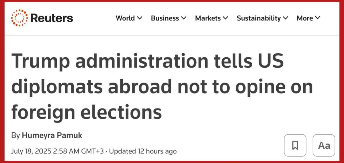 Госсекретарь США Рубио запретил американским дипломатам комментировать честность и прозрачность выборов в других странах, сообщает Reuters «В сообщениях следует избегать высказываний относительно справедливости или честности избирательного процесса, его легитимности или демократических ценностей рассматриваемой страны. Когда уместно комментировать выборы в другой стране, наше сообщение должно быть кратким, сосредоточенным на поздравлениях победившему кандидату и, где это уместно, на отметке общих внешнеполитических интересов», — говорится в телеграмме. Такие заявления будет делать сам госсекретарь, либо официальный представитель Госдепа. В документе упоминается речь Трампа от 13 мая в Эр-Рияде, в которой он осудил критиков режимов Ближнего Востока, заявив, что это больше не дело Вашингтона. При этом Reuters напоминает, что чиновники Трампа сами неоднократно критиковали Европу за подавление правых кандидатов, в частности, в Румынии, Германии и Франции. Подпишись на Телеграм Алексан