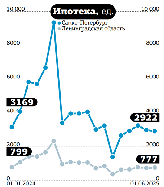 Если сравнивать результаты первого полугодия 2025–го с аналогичным периодом прошлого года, то оптимизм по поводу восстановления спроса кажется преждевременным. Количество и объём выданной ипотеки упали вдвое. Однако сопоставлять два периода не совсем корректно. В январе–июне 2024–го действовала льготная ипотека, а рыночные ставки были близки к ключевой, которую удерживали на уровне 16%. Всё первое полугодие 2025–го спрос на кредиты для покупки жилья находился под давлением запредельных ставок из–за высокой ключевой, плюс прекратили существование субсидируемые программы (вместо массовой "господдержки" под 8% годовых петербуржцам стала доступна лишь семейная ипотека).