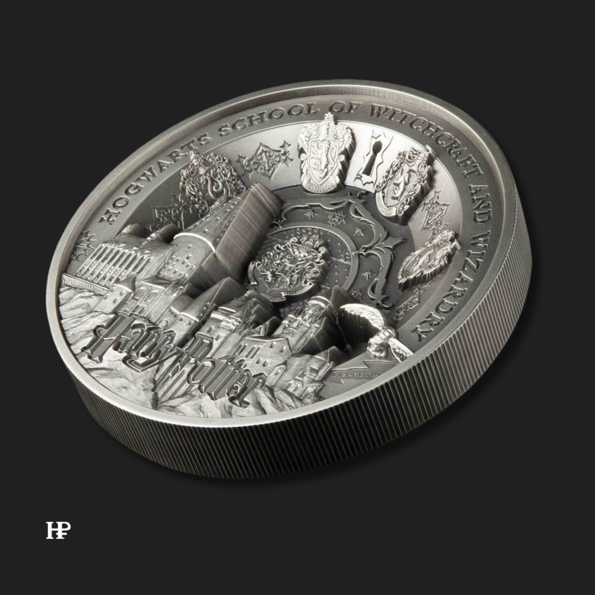 Волшебная монета 25 долларов «3D Hogwarts Silver Giant» (Самоа, 2021 года) посвящена знаменитой школе чародейства и волшебства Хогвартс из саги о Гарри Поттере. Выпускается она по официальной лицензии Wizarding World (Warner Brothers). Главная особенность монеты — применение техники многоуровневого ультра–высокого рельефа, известной как Multiple Layer. Технологию применяют лишь некоторые монетные дворы для создания 3D–эффекта. Такая техника позволяет отдельным элементам рельефа занимать разную высоту: замок Хогвартс выступает максимально, фон и эмблемы выполнены в углублении. Многослойное решение создаёт впечатляющий объём и контраст. Комбинация с патиной усиливает эффект — тени в углублениях делают композицию живой, словно вы держите в руках мини макет волшебного мира. Реверс На переднем плане — замок Хогвартс в ультра рельефе, окружённый гербами факультетов: Гриффиндор, Слизерин, Пуффендвей и Когтевран. Вокруг — эмблемы школы, сова Хедвиг и логотип «Harry Potter». Глубокий рельеф соз