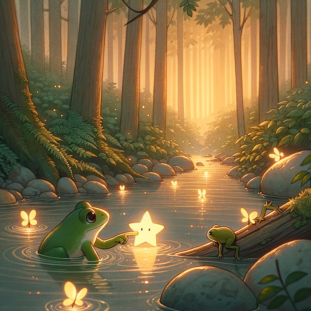 Квакуша, которая была известна своей мудростью и добротой во всём лесу, медленно подплыла ближе, её большие, добрые глаза с любопытством смотрели на необычное свечение. Она видела много странного в своём ручейке, но падающая звезда – это было что-то совершенно новое. Она подплыла ещё ближе и увидела маленькую, дрожащую искорку света, которая лежала среди камешков. Это была Искорка.