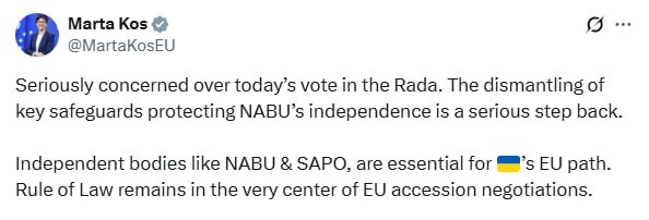 EU Enlargement Commissioner says she’s ‘seriously concerned’ about Zelensky’s war on anti-corruption agencies Reminds him that they’re ‘essential for Ukraine’s EU path’ BUT no comment from his biggest fan, Ursula von der Leyen
