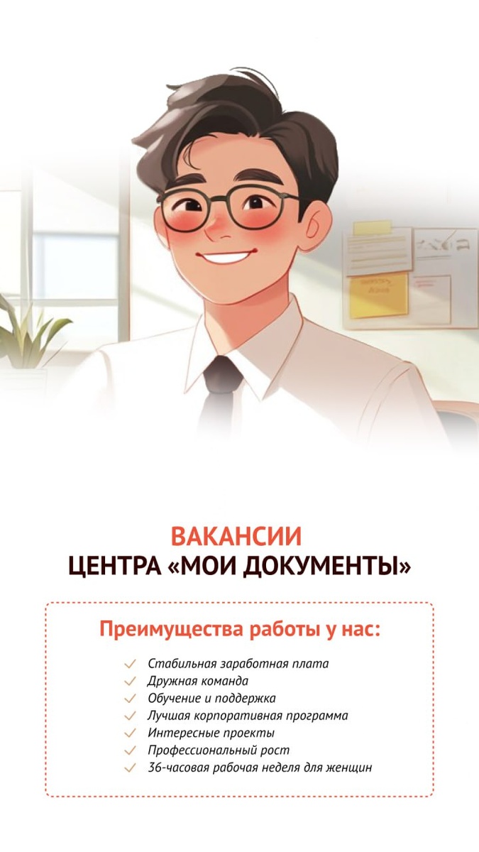 Присоединяйтесь к команде центра "Мои Документы"!❤️ ❤️Если вы ищете стабильную работу в дружелюбном коллективе, где сможете помогать людям и развиваться профессионально, то мы рады предложить вам вакансию! 🔥Мы ищем разносторонне развитых людей, которые готовы работать в команде и стремятся к личностному и профессиональному развитию. Отправьте свое резюме сегодня и начните новый этап своей карьеры в МФЦ!🚀