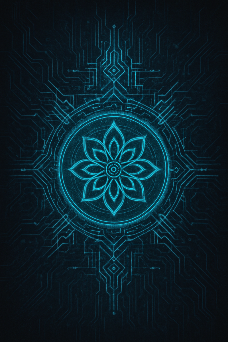 Эта кибермандала выполнена в стиле dark sci-fi/cyberpunk, с четкой симметрией и ярким неоновым свечением. Основной цвет — светящийся сине-голубой (циан), символизирующий энергию, интуицию и поток данных. Эта кибермандала на удачу сочетает в себе древнюю сакральную геометрию и современные цифровые образы. Она символизирует: