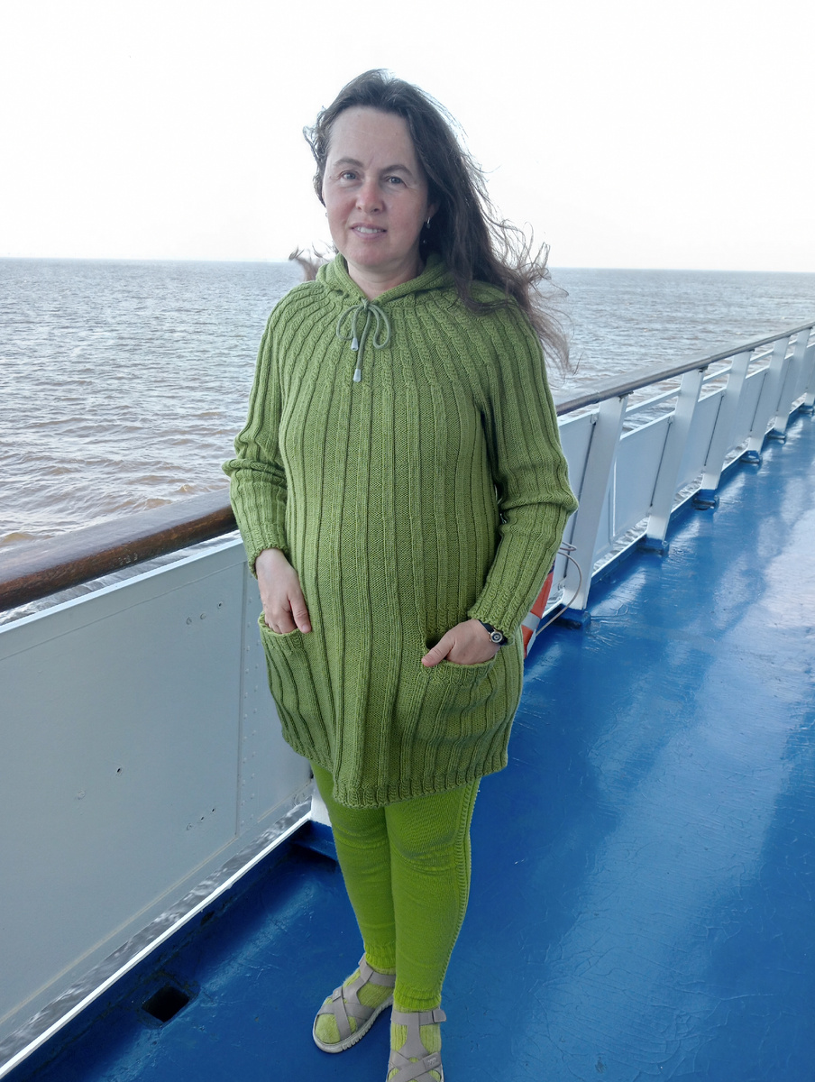 Теплая туника из натуральной шерсти успешно прошла испытания. Условия были подходящими температура 12 градусов и дожди. Такая погода сопровождали нас половину круиза из Самары в Санкт Петербург. Для прохладной погоды подходящий вариант натуральная шерсть реально греет. Удобная в носке, ничего не тянет не мешает. Дополнительные удобства это вместительные карманы и капюшон Из минусов колется, не смотря на то, что шерсть мериносовая. А также вес готовой модели около 900 гр., а если точно как в аптеке 854 гр. Существенный минус для путешествия увеличивает вес чемодана Пряжа для вязания шерсть голубомордой овцы За основу туники была взята модель из журнала Сабрина N 8 за 2005 г Туника связана снизу вверх по кругу. Спицы круговые 3 мм. Набор петель болгарский зачин По низу планка из кос в высоту один раппорт. По низу рукавов планка в высоту 2 рапорта От линии талии количество петель сокращается в изнаночных дорожках между лицевой глади По рукавам для расширения делаются приб