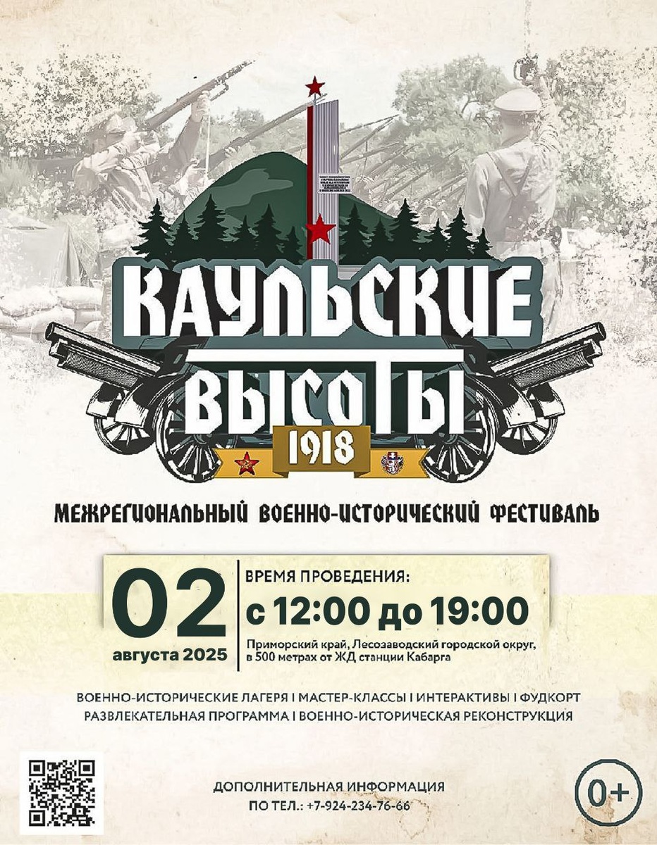 С радостью сообщаем, что 2 августа 2025 года в Лесозаводском городском округе (в 500 метрах от станции Кабарга, Приморский край) пройдет масштабный фестиваль "Каульские Высоты"! 📌 Время проведения: с 12:00 до 19:00. Вход свободный! Программа фестиваля: 🎖 Военно-историческая реконструкция боев лета 1918 года - зрелищное воссоздание событий, когда красноармейцы Уссурийского фронта одержали победу над белочехами в районе Каульских высот 📜 Историческая справка о событиях гражданской войны на Дальнем Востоке 🛠 Интерактивные площадки и мастер-классы для гостей всех возрастов, можно будет: научиться работать с прялкой, посетить лазарет, полевую почту и полностью погрузиться в атмосфере того времени! 🥘 Будет работать фуд-зона 🏕 Кемпинг и вечерняя программа Контакты организаторов: 📞 Кирилл Башинский: +7 924 234-76-66 📞 Евгения Набока: +7 929 403-34-44 📞 Александр Некрасов: +7 994 014-18-78 📌 Так же предлагаем вам подписаться соц сети главных организаторов фестиваля: вк фестиваля