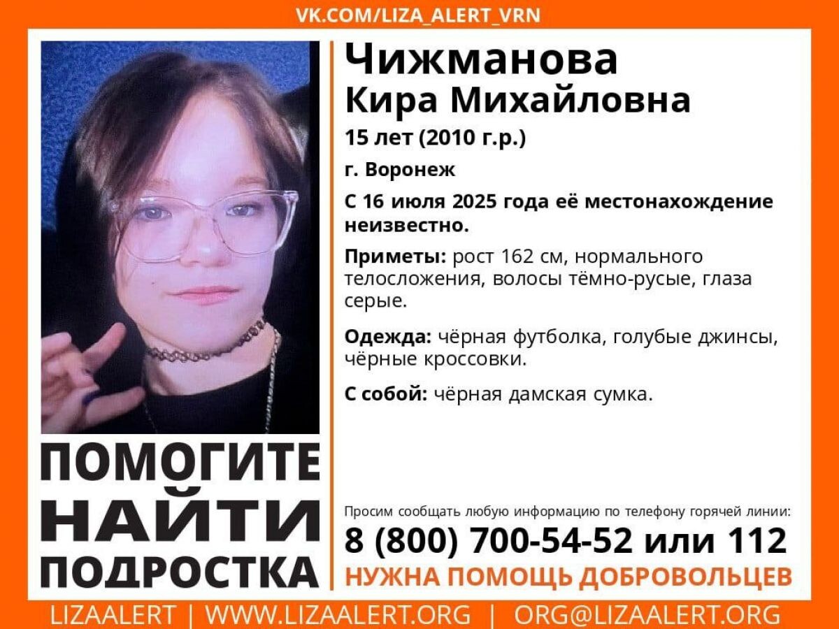 В Воронеже объявили поиски 15-летней девочки. Ориентировку распространила группа «Лиза Алерт». Кира Чижманова исчезает уже не в первый раз. Волонтёры напоминают её приметы: рост 162 см, нормальное телосложение, серые глаза и тёмно-русые волосы. На школьнице были голубые джинсы, чёрная футболка и кроссовки, с собой — чёрная дамская сумка. Известно, что в этот раз Кира ушла из дома без предупреждения 16 июля. Живёт девочка с родственниками. Пропадает 15-летняя школьница уже минимум в четвёртый раз. По крайней мере, в декабре был третий по счёту. Тогда поиски Киры длились 12 дней.