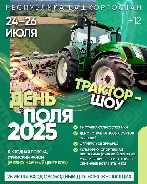 На республиканском семинаре «День поля-2025» обсудят стратегию уборочной кампании в Башкортостане ✔️ В Республике Башкортостан с 24 по 26 июля пройдет региональный семинар «День поля-2025». Запланирована обширная деловая программа, где будут говорить о тактике и стратегии уборочных работ. — Обсудим готовность сельхозпредприятий республики к уборочным работам, а элеваторов и перерабатывающих пере приятий к приемке урожая. Ознакомимся с производственными опытами, чтобы воочию убедиться насколько эффективен тот или иной сорт, гибрид в условиях нашей республики, — сказал заместитель Премьер-министра Правительства Башкортостана – министр сельского хозяйства Ильшат Фазрахманов. ℹ️ 26 июля предусмотрен день свободного посещения. Посетители смогут посмотреть образцы современной сельскохозяйственной техники, посидеть в кабине водителя или оператора.