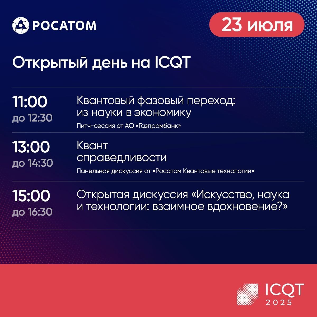 ☀️ Сегодня стартует открытый день VIII Международной конференции по квантовым технологиям ICQT-2025. На карточке делимся с вами программой на сегодня, а на странице конференции можно узнать все подробности 🖱 ⏳ Ждём вас в «Radisson Collection Hotel Moscow» - основной площадке ICQT. А мы по традиции будем делиться самыми яркими моментами события в нашей группе. Следите за обновлениями!