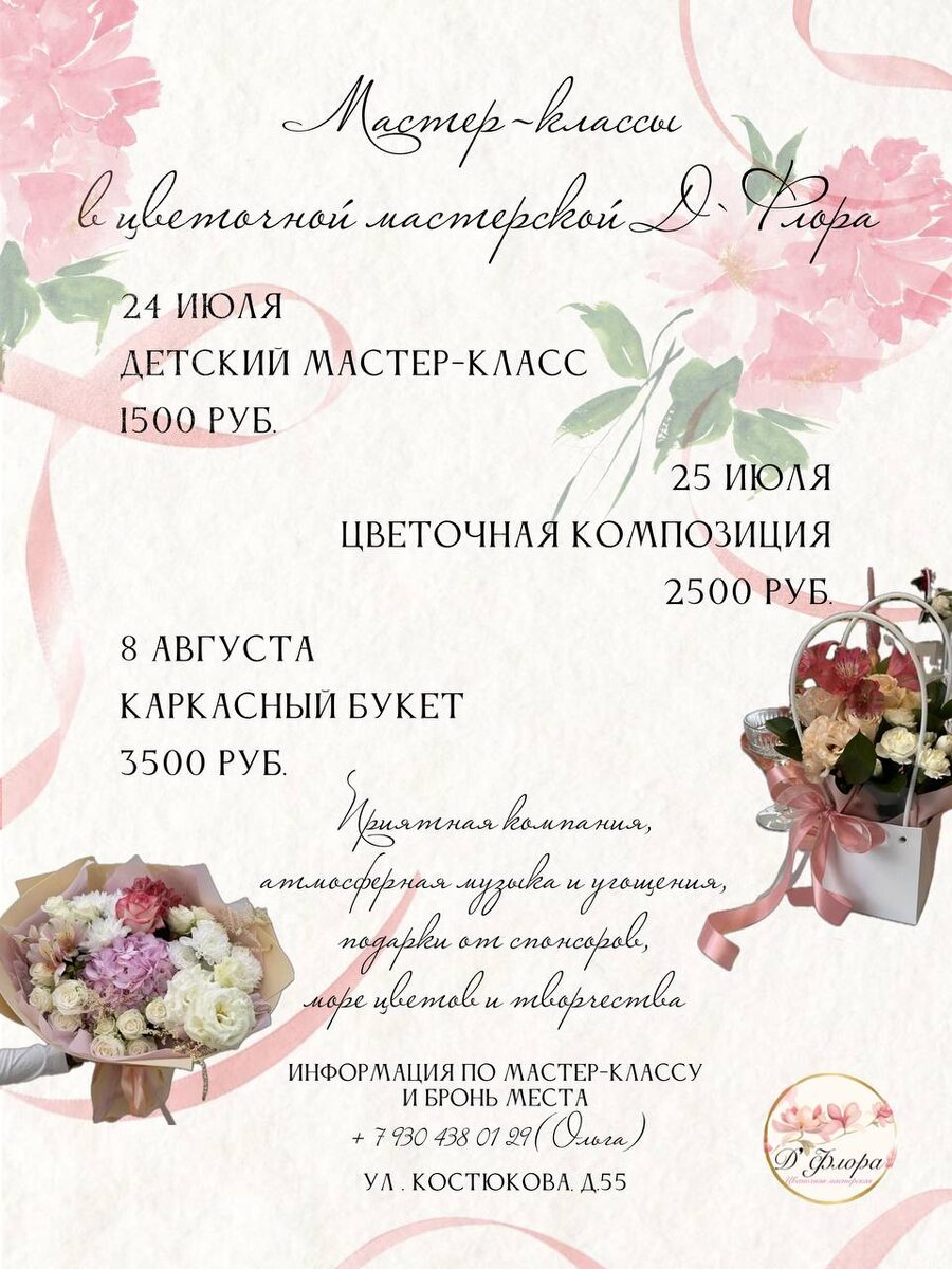 Хотели бы погрузиться в мир цветов и творчества? 🌸 Да? Тогда вам точно понравятся мастер-классы, о которых мы сейчас расскажем!) #идёмплатно 24, 25 июля и 8 августа по адресу: Белгород, ул. Костюкова, д. 55 ➡️ Уточнить все детали можно, написав @muzaleva_ol Каждый мастер-класс проходит в тематическом оформлении, в стоимость включены вкусные угощения и напитки. Кроме того, участники МК не только создадут цветочные шедевры, но и получат приятные бонусы✨ ➡️ Расписание встреч: — 24 июля в 18:30 / детский мастер-класс «Цветочная фантазия»; — 25 июля 18:30 / мастер-класс по составлению цветочной композиции в коробке; — 8 августа 18:30 / мастер-класс по созданию шикарного букета на каркасе. Как вам идея? ❤️ — мне очень нравится) 🙏🏻 — обязательно нужно сходить! Не забудьте подписаться на наш канал ❤️