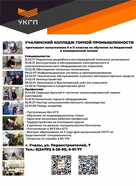 На случай, если ты не хочешь листать посты в поисках специальностей и профессий — держи свежий! Мы позаботились о том, чтобы нужная информация была в первых рядах Специальности: 21.02.17 Подземная разработка месторождений полезных ископаемых 13.02.13 Эксплуатация и обслуживание электрического и электромеханического оборудования (по отраслям) 21.02.18 Обогащение полезных ископаемых 09.02.07 Информационные системы и программирование 23.02.07 Техническое обслуживание и ремонт автотранспортных средств 21.02.19 Землеустройство 38.02.01 Экономика и бухгалтерский учёт (по отраслям) 43.02.15 Поварское и кондитерское дело 44.02.02 Преподавание в начальных классах Профессии: 15.01.05 Сварщик (ручной и частично механизированной сварки (наплавки)) 21.01.10 Ремонтник горного оборудования 35.01.27 Мастер сельскохозяйственного производства 43.01.09 Повар, кондитер Приёмная комиссия работает по адресу: г. Учалы, ул. Первостроителей, 7. График работы… https://uchaly102.ru/?p=93221