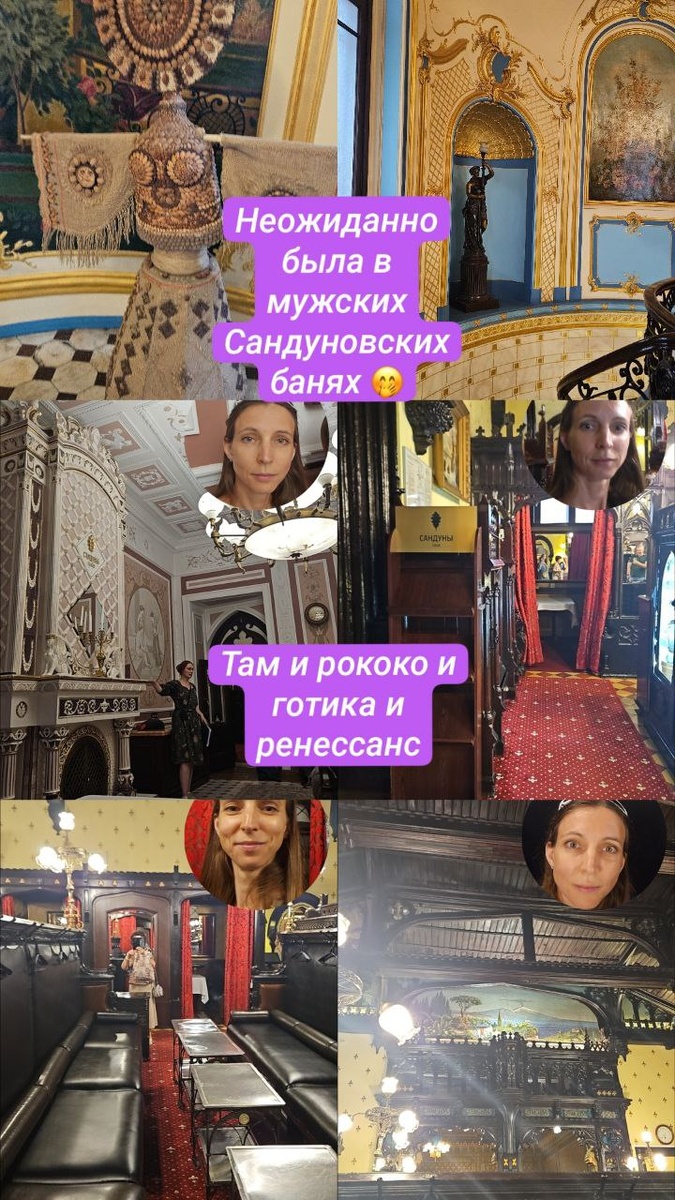 #радость_открытий@happy_family_way 🛁Вчера неожиданно оказалась в мужских Сандуновских банях 🤭 Никогда бы не подумала, что в баню ходят экскурсией, как в музей. Но и даже, когда меня пригласили на такое необычное мероприятие, я не могла предположить, что там будет так. Думала, что-то узнаю новое о процессе парения, а узнала больше об истории и архитектуре. (Хотя вообще логично же наверно было предположить, что если пригласила на экскурсию агент по недвижимости @Alieva_Sveta, то речь будет больше идти о зданиях и помещениях. 😁) В общем там было неожиданно красиво и разнообразно: и Рококо, и Готика, и Ренессанс. Словное каждое помещение в своём особом стиле. В одном на потолке написано по-арабски "Хвала Аллаху", в другом мозайка, как картина и икона, в третьем скульптуры. Есть парение "по-чеховски", "по-маяковски" (у Маяковского была своя лавка из мрамора именная, т.к. был большим чистюлей), "по-шаляпински", "по-пушкински", "по-горьковски". (Пушкин пытался туда хамам внести, н