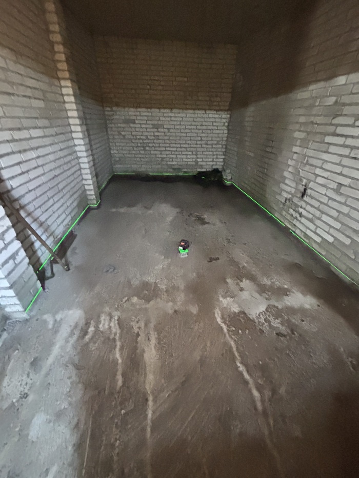 Пол изначально планировал поднимать на 10 см, сделали разметку, отметили, рассчитали материал. Но после общения с соседями все же решил поднимать на 15 см, больше не меньше. Заказали пленку, сетку, арматуру, стяжки, подставки под сетку и доску, для установки у ворот в качестве опалубки. Вторник, 8 утра, приехали мастера и убрав лишний мусор начали укладывать пленку, настраивать сетку и готовиться к приезду миксера. По древнейшей традиции положил монетку в уголок) Заехали без проблем, только страхуя миксер от кабелей лишь в одном месте. Около 2.5м3 бетона марки м350. Далее уплотнение глубинным вибратором, затем выравнивание при помощи правило В 10, 30 работа окончена, гараж закрываем, рассчитываемся и получаем дальнейшие инструкции по проливке. Через 7 часов бетон начал набирать плотность, пальцем не продавливаться, делаю первое увлажнение. Сначала взял распылитель, потом уже, полил из ковша 10-ю литрами воды. Следующий пролив сделал в тот же день, равномерно пролив из ковша еще 10 литр