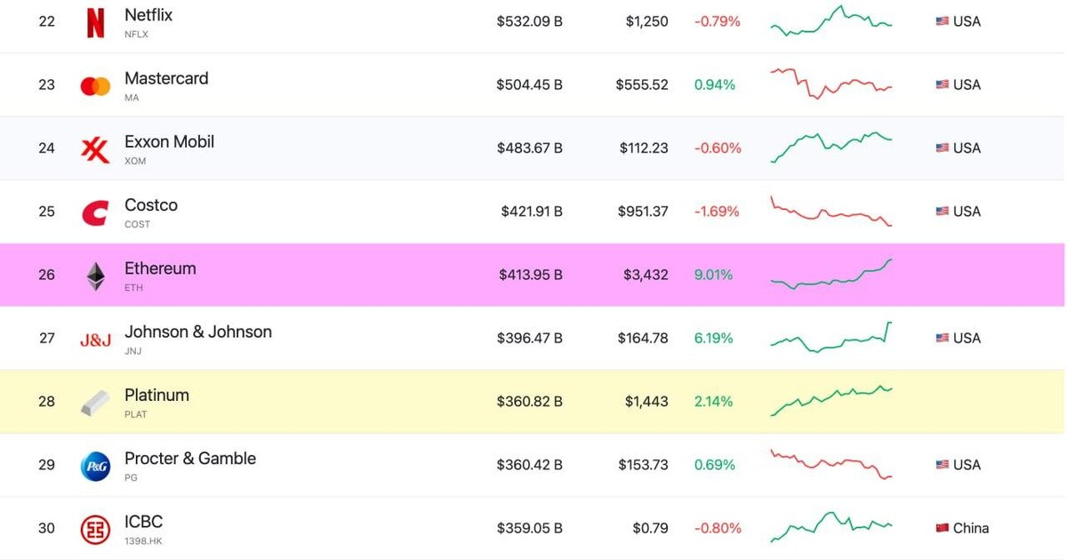 💰 Ethereum just leveled up, surpassing Johnson & Johnson to snag 26th place on the global leaderboard! 🚀 With a peak of $3,400 and a