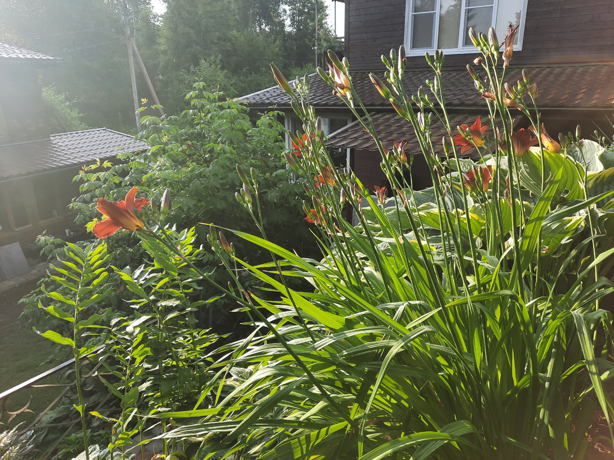 В цветнике под яблоней раньше росли. Я давно все оттуда пересадила, потому как болели. а одна вот сама выросла из маленькой луковки, оставшейся в корнях. Пукай пока растет...