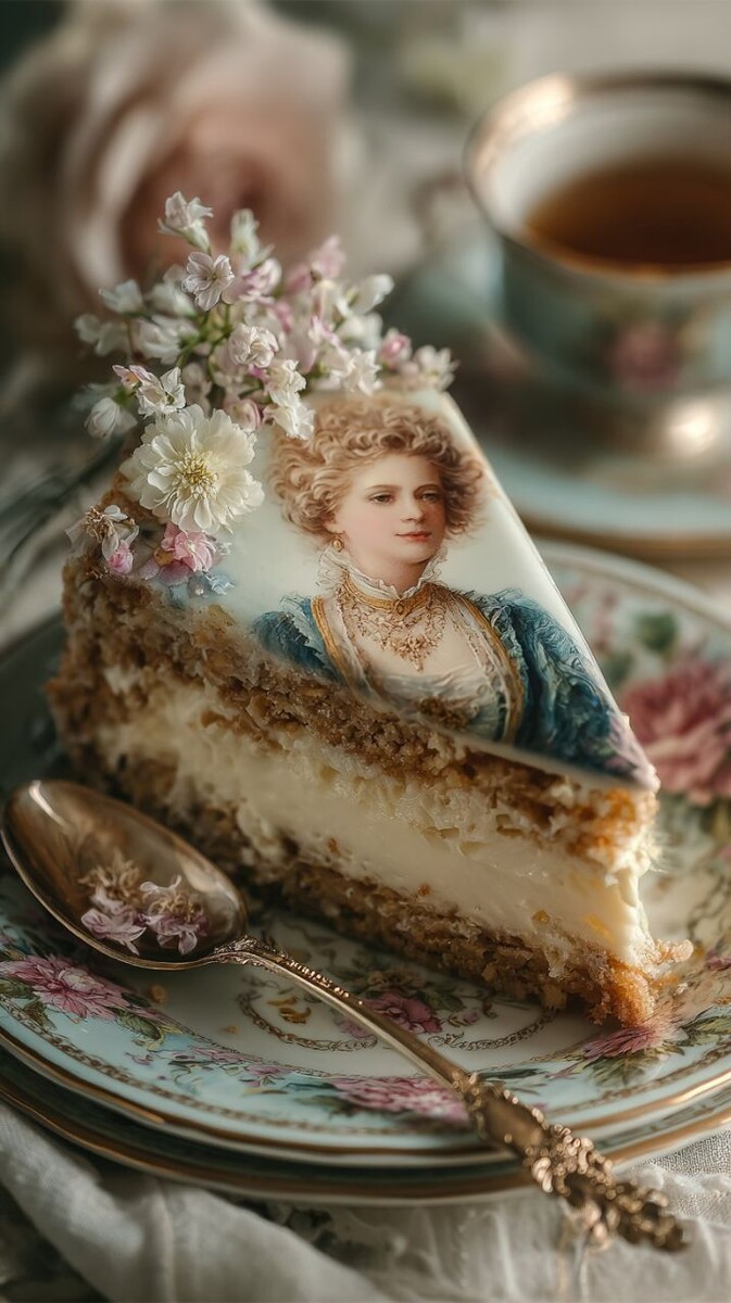 Macro photo of a slice of cream-covered cake on a softly colored floral saucer. The inside of the cake is replaced with a smooth porcelain surface featuring a hand-painted vintage portrait of a lady in 18th century attire, inspired by Limoges-style French porcelain. The glaze reflects soft golden light. A small ornate spoon rests beside the dish. Romantic mood, pastel palette, shallow depth of field --ar 9:16 --v 7 --style raw --stylize 350 --exp 18 👇 https://t.me/syntxaibot?start=aff_1071284138