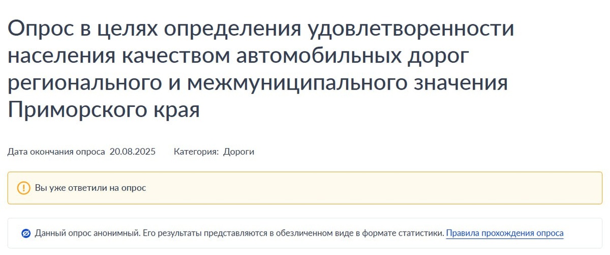 ❗️Гражданам предлагают объективно высказать мнение о состоянии дорог в Приморье через опрос на Госуслугах. Желающим надо перейти по ссылке, войти в аккаунт сервиса и ответить на ряд вопросов. Надо будет рассказать, водителем каких категорий вы являетесь, на каком авто ездите, куда, во сколько и что не устраивает. Пройти можно как физическому, так и юридическому лицу. Но даже если вы не пользуетесь автомобильными дорогами как водитель, можно ответить как пассажир. Всего 7 вопросов, у нас заняло это не более 5 минут. В последнем можно высказать свои пожелания, предложения или уточнить, какой именно участок вызывает у вас недовольство. 🟥 Подписаться | Предложить новость